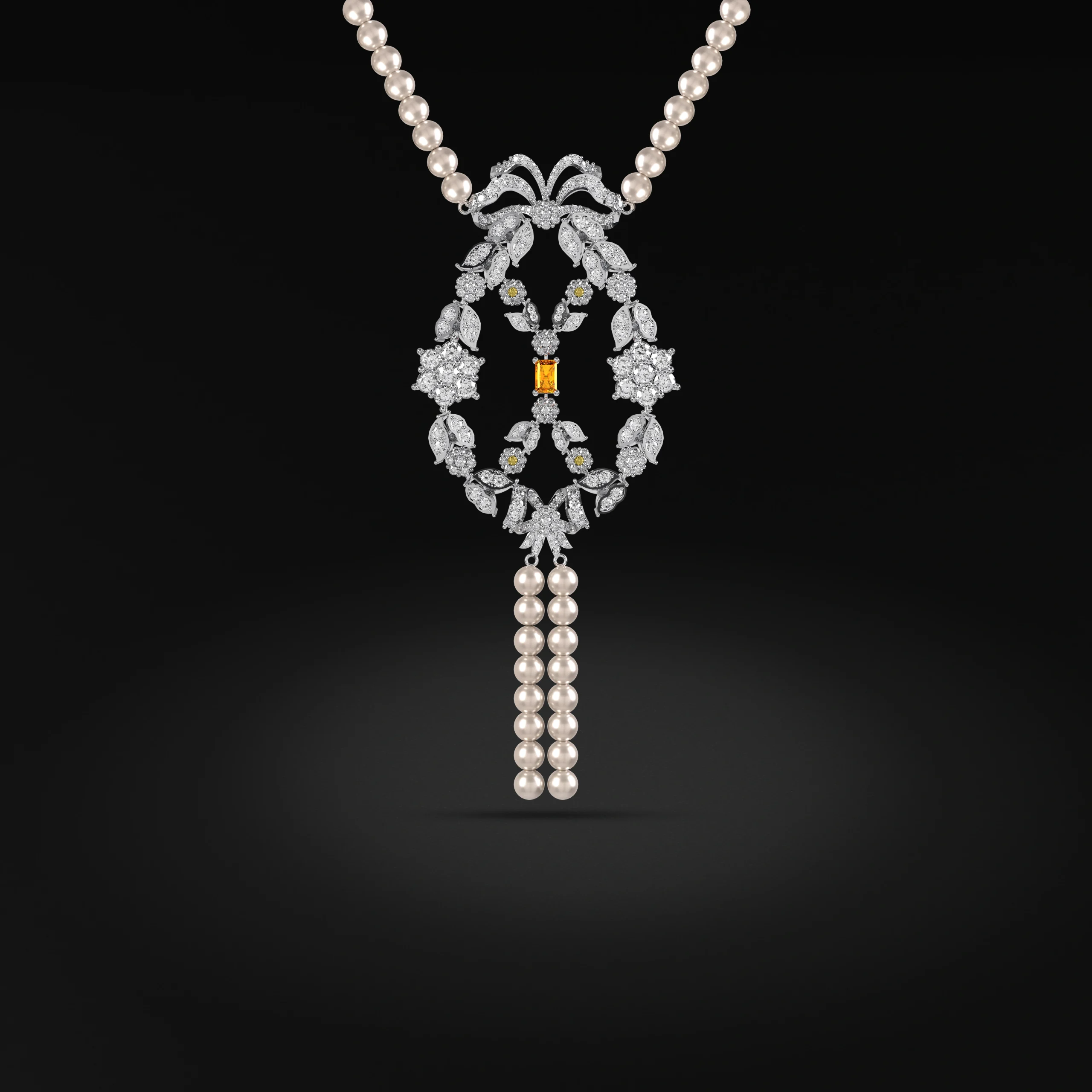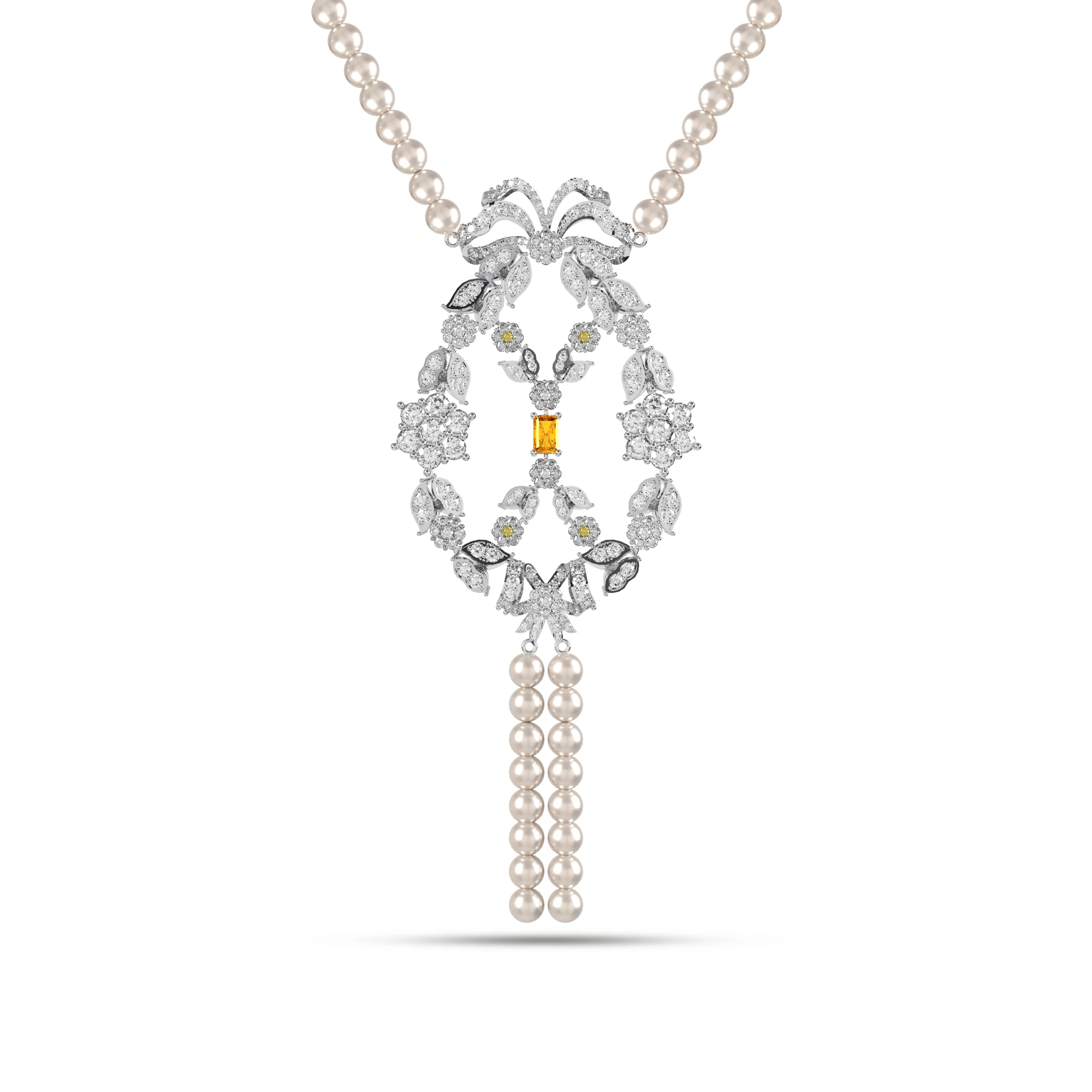 Victoria Necklace, crafted from 13.14g of white gold and featuring 6.26 carats of sparkling diamonds. A vibrant 0.86-carat yellow sapphire adds a touch of sunny elegance, making this necklace a statement piece for special occasions or an extraordinary gift.